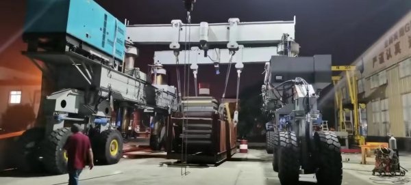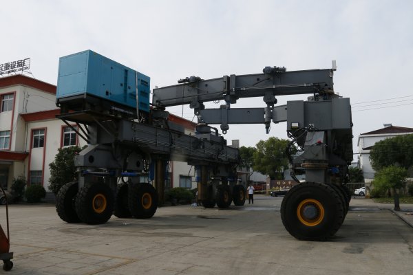 首先從外形上看,這款龍門吊屬于大型設(shè)備,客戶要的這款不是常規(guī)的液壓龍門吊,既可以行走,又可以折疊。看龍門吊上的輪胎,有16個,輪胎的高度也是比較高的,整臺設(shè)備的整體高度高達(dá)4米多。