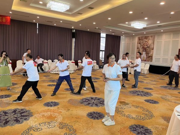 首先是大家準時抵達會場,然后依次排隊,分別報數(shù)1-4,然后相同數(shù)字的伙伴們組成各自的隊伍,分別選擇一名隊長與副隊長,給本隊選取隊名與口號,然后小組合照,只能靠自己小隊人員完成,根據(jù)完成時間及質(zhì)量給予第一輪的評分。然后進入比賽活動環(huán)節(jié),第一項是拔河比賽,這主要是靠實力說話的,每隊選擇8名成員上場,展開激烈的比拼。第二項是你表演我猜,每隊8個成員,第一個根據(jù)看到的文字,通過肢體動作比劃表演出來傳給第二個小伙伴,依次向后,最后一個伙伴根據(jù)比劃動作說出答案。第三項是動力火車,每個隊友將右手搭在前面一個伙伴的肩上,抬起左腳,同時用左手去抓前面隊友的左腳,以蹦跳的方式,看哪組先到達終點。最后一項是兩人三足障礙賽,相鄰兩人的腳綁在一起,從起點走到終點,快的一組獲勝。經(jīng)過長達4小時的比賽,活動圓滿完成,比賽過程中,充滿了歡聲笑語,當然,大家斗智斗勇,出謀劃策,都努力著給本隊爭取更優(yōu)異的成績。