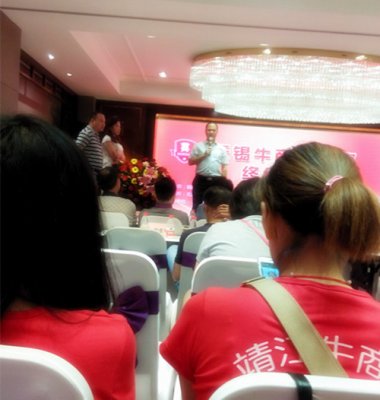 這次的會議主持仍是靖江牛商會胡會長和袁小瓊這對黃金搭檔來共同主持。會議開始后,首先由無錫牛商會長王秋芬女士上臺致辭,王會長問大家知道無錫牛商會的的宗旨是什么?繆旭君總司令回答道:“無 錫牛商強(qiáng)力生長,無錫無錫創(chuàng)造奇跡!” 這次牛商爭霸賽中,無錫牛商可謂是表現(xiàn)出眾,超額完成任務(wù) !3個月牛商爭霸賽原定目標(biāo)1.2億,實際完成達(dá)1.3億!