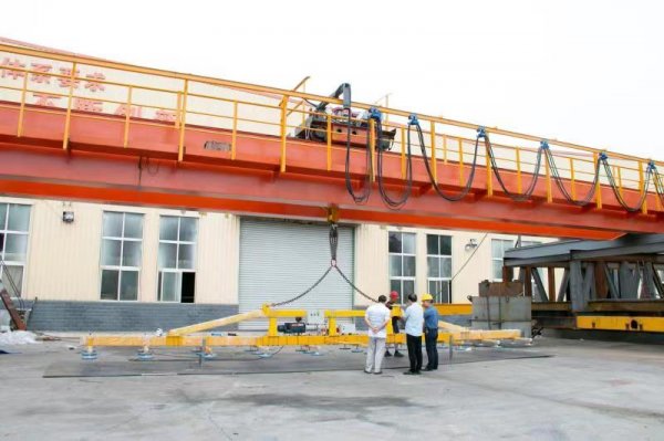 電磁橋式起重機的主要部分是磁鐵。接通電流,電磁鐵便把鋼鐵物品牢牢吸住,吊運到指定的地方。切斷電流,磁性消失,鋼鐵物品就放下來了。電磁起重機使用十分方便,但必須有電流才可以使用,可以應(yīng)用在廢鋼鐵回收部門和煉鋼車間等。利用電磁鐵來搬運鋼鐵材料的裝置叫做電磁起重機。電磁起重機能產(chǎn)生強大的磁場力,幾十噸重的鐵和其他各種鐵料,不裝箱不打包也不用捆扎,就能很方便地收集和搬運,不但操作省力,而且工作簡化了。