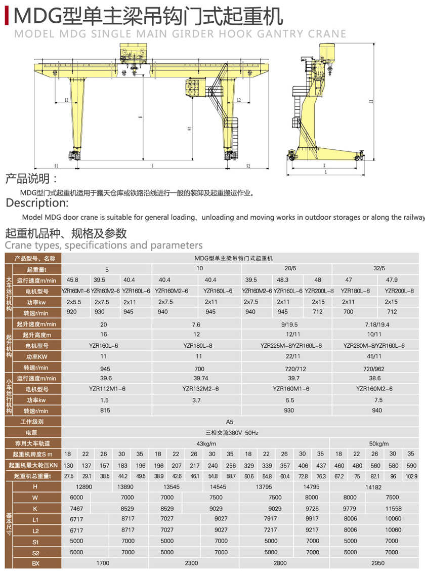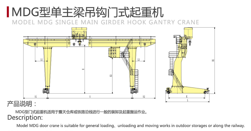 MDG型門式起重機(jī)適用于露天倉(cāng)庫(kù)或鐵路沿線進(jìn)行一般的裝卸及起重搬運(yùn)作業(yè)