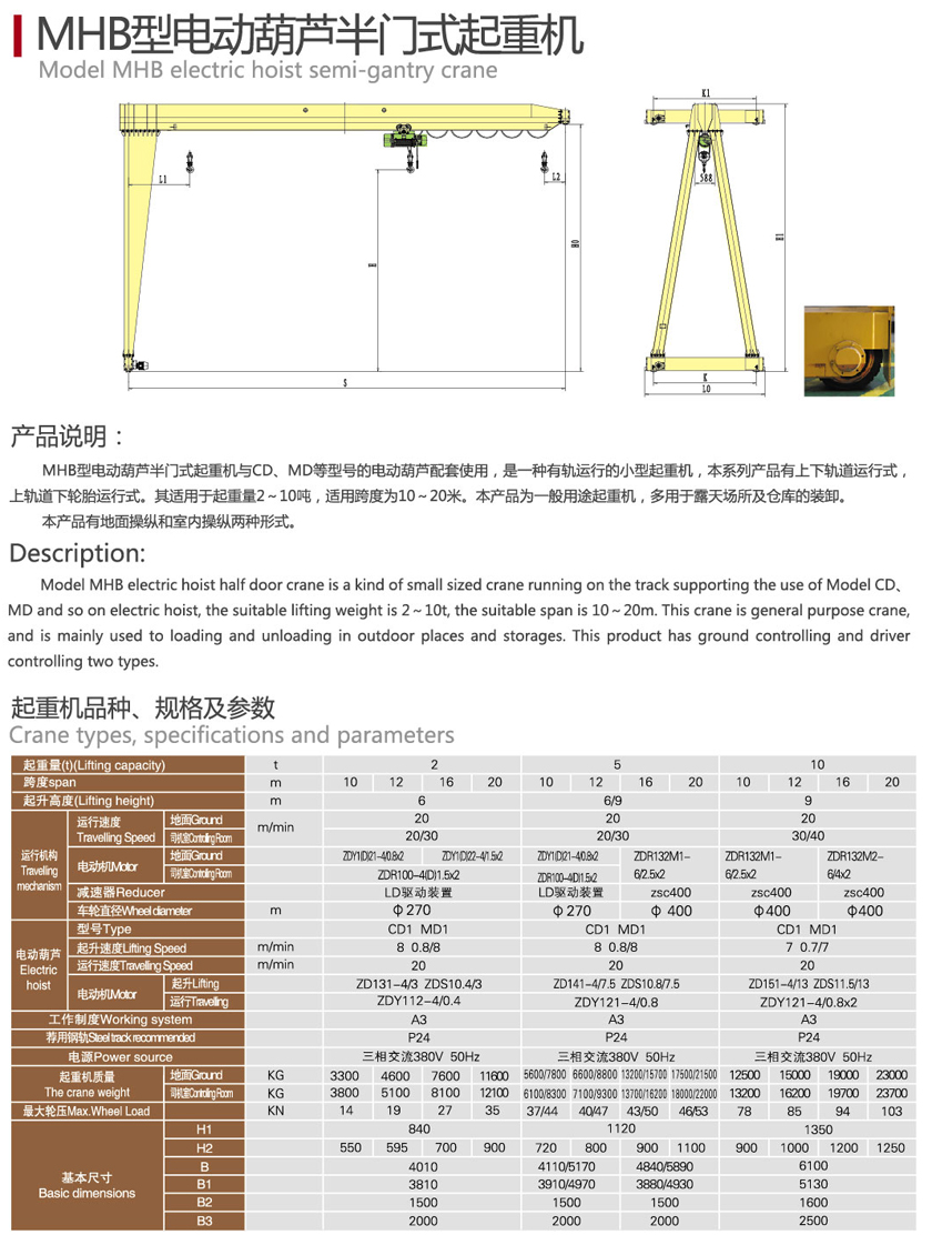 MHB型電動(dòng)葫蘆半門式起重機(jī)與CD、MD等型號(hào)的電動(dòng)葫蘆配套使用,是一種有軌運(yùn)行的小型起重機(jī),其適用于起重量2~10噸,適用跨度為10~20米。本產(chǎn)品為一般用途起重機(jī),多用于露天場所及倉庫的裝卸。本產(chǎn)品有地面操縱和室內(nèi)操縱兩種形式。