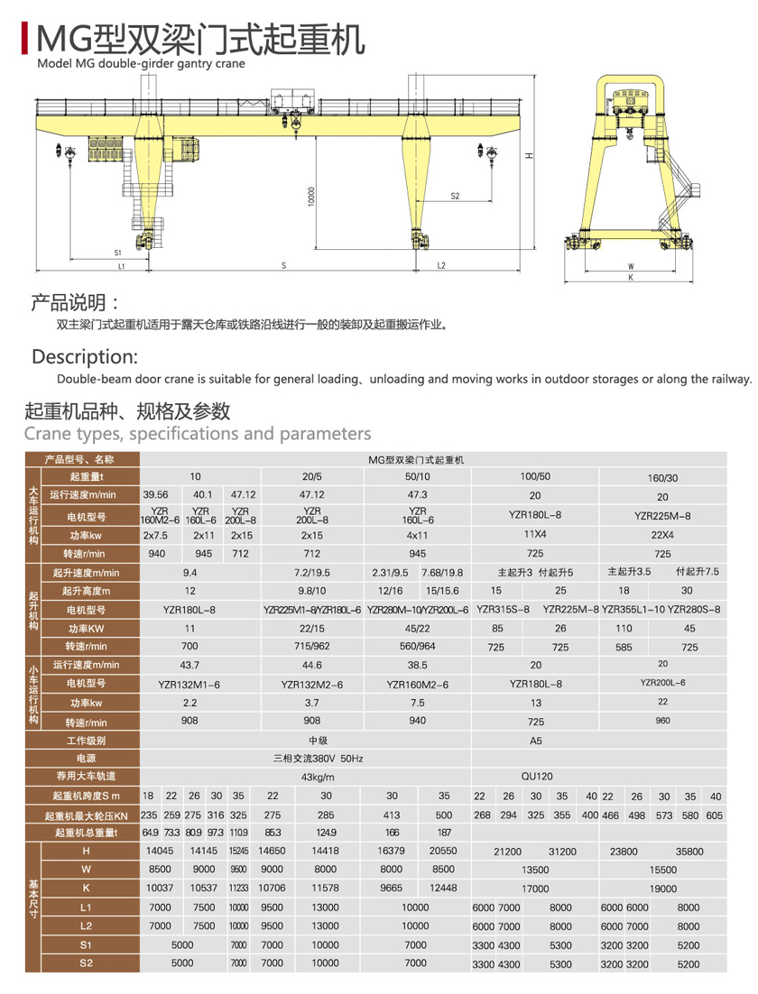 雙主梁門式起重機(jī)適用于露天倉庫或鐵路沿線進(jìn)行一般的裝卸及起重搬運(yùn)作業(yè)。