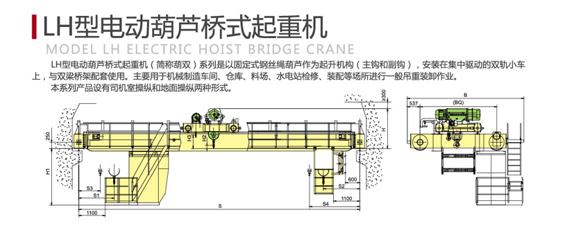 LH型電動(dòng)葫蘆橋式起重機(jī)為一般用途起重機(jī),多用于機(jī)械制造、裝配、倉(cāng)庫(kù)等適用頻度低或額定起重量起吊次數(shù)少的場(chǎng)所,小車在主梁鋪設(shè)的軌道上運(yùn)行的雙主梁結(jié)構(gòu)橋式起重機(jī),該起重機(jī)與CD1,MD1等形式的固定式電動(dòng)葫蘆配套使用,本起重機(jī)設(shè)有底面、操縱室、遙控三種操縱形式,操縱室又設(shè)有端面及側(cè)面開(kāi)門(mén)兩種形式,以供用戶選擇使用。本起重機(jī)的優(yōu)點(diǎn)為使用穩(wěn)定性較好、充分利用車間、凈空高度合適,缺點(diǎn)為工作級(jí)別低,不適用繁重車間。