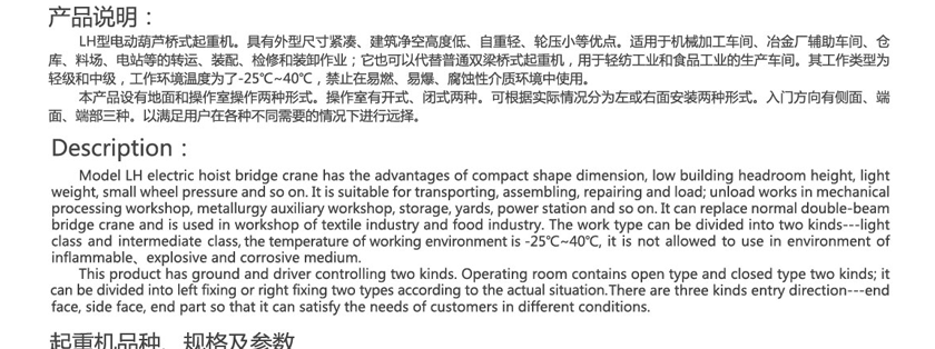 LH型電動(dòng)葫蘆橋式起重機(jī)。具有外型尺寸緊湊、建筑凈空高度低、自重輕、輪壓小等優(yōu)點(diǎn)。適用于機(jī)械加工車間、冶金廠輔助車間、倉(cāng)庫(kù)、料場(chǎng)、電站等的轉(zhuǎn)運(yùn)、裝配、檢修和裝卸作業(yè);它也可以代替普通雙梁橋式起重機(jī),用于輕紡工業(yè)和食品工業(yè)的生產(chǎn)車間。其工作類型為輕級(jí)和中級(jí),工作環(huán)境溫度為了-25℃~40℃,禁止在易燃、易爆、腐蝕性介質(zhì)環(huán)境中使用。