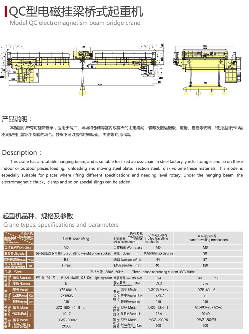 本起重機(jī)帶有可旋轉(zhuǎn)掛梁,適用于鋼廠、堆場(chǎng)和倉(cāng)儲(chǔ)等室內(nèi)或露天的固定跨間,裝卸及搬運(yùn)鋼板、型鋼、盤(pán)卷等物料。特別適用于吊運(yùn)不同規(guī)格且需水平旋轉(zhuǎn)的場(chǎng)合。掛梁下可以攜帶電磁吸盤(pán)、夾鉗等專用吊具。
