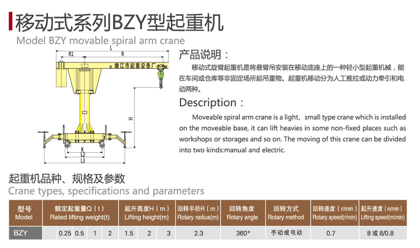 移動(dòng)式旋臂起重機(jī)是將懸臂吊安裝在移動(dòng)底座上的一種輕小型起重機(jī)械,能在車間或倉庫等非固定場(chǎng)所起吊重物。起重機(jī)移動(dòng)有兩種:旋臂旋轉(zhuǎn)有手動(dòng)和電動(dòng)旋轉(zhuǎn)。
