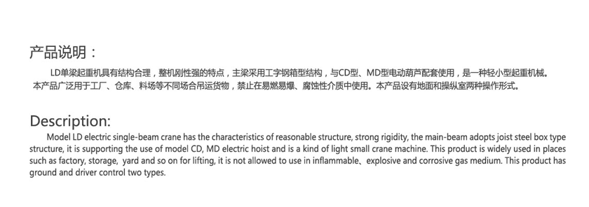 LD單梁起重機(jī)具有結(jié)構(gòu)合理,整機(jī)剛性強(qiáng)的特點(diǎn),主梁采用工字鋼箱型結(jié)構(gòu),與CD型、MD型電動(dòng)葫蘆配套使用,是一種輕小型起重機(jī)械。本產(chǎn)品廣泛用于工廠、倉(cāng)庫(kù)、料場(chǎng)等不同場(chǎng)合吊運(yùn)貨物,禁止在易燃易爆、腐蝕性介質(zhì)中使用。